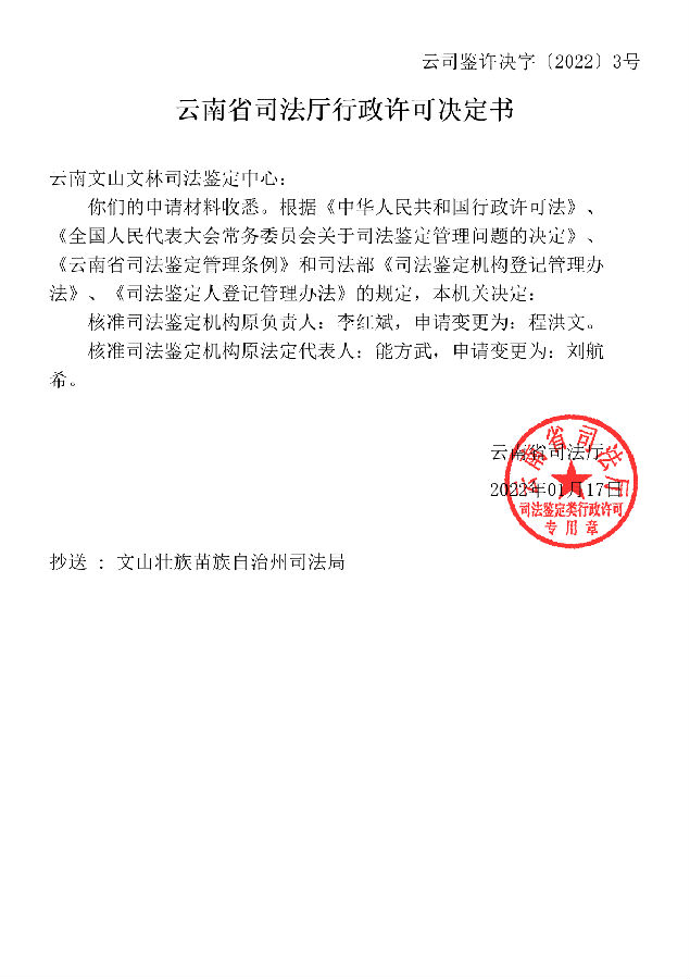 云南省司法厅行政许可决定书(云司许决字〔2022〕第3号)