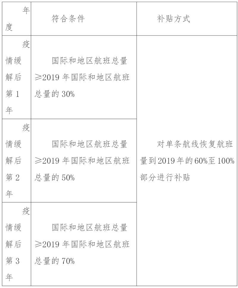 疫情缓解后3年内,同一航空公司本年度恢复从省内始发国际和地区航班总量分别超过2019年度航线航班总量的30%、50%、70%后,对单条航线恢复航班量超过2019年航班量60%以上的部分给予补贴。